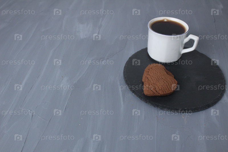 Завтрак в день святого валентина кофе и печенье сердце на подносе черный на сером фоне с местом для копирования текста. Романтический сюрприз с едой