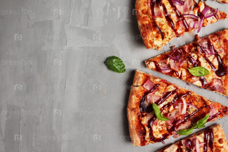 Пицца на сером фоне с темным кисло-сладким соусом и базиликом. с пространством для текста copyspace. быстрое питание
