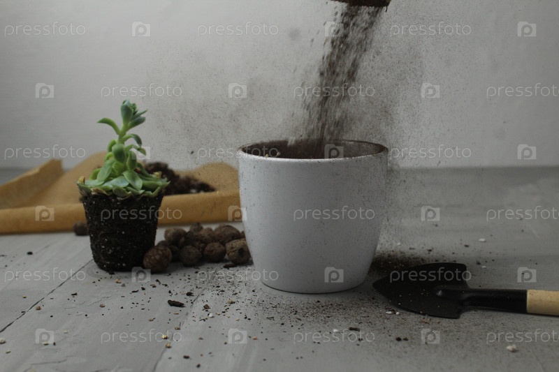Посадка суккулентов в горшок на сером фоне. Пересадка цветов растений весной. насыпать землю в горшок для цветочного растения