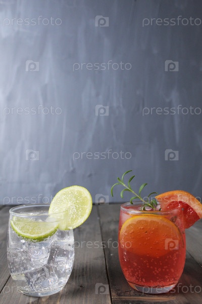 Лимонадный коктейль из воды, соды, ледяного сиропа и фруток лайма, лимона и грейпфрута. Домашние коктейли. Подготовка к праздничной вечеринке