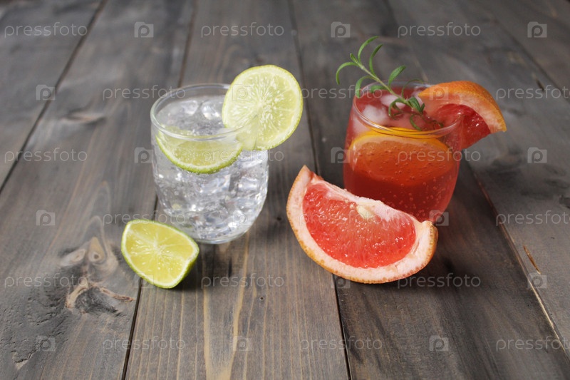 Лимонадный коктейль из воды, соды, ледяного сиропа и фруток лайма, лимона и грейпфрута. Домашние коктейли. Подготовка к праздничной вечеринке