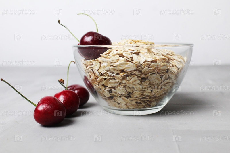 Овсяная каша овсяная каша в стеклянной миске с вишневыми ягодами на сером фоне с пространством для текста и кописпейса. здоровое диетическое питание