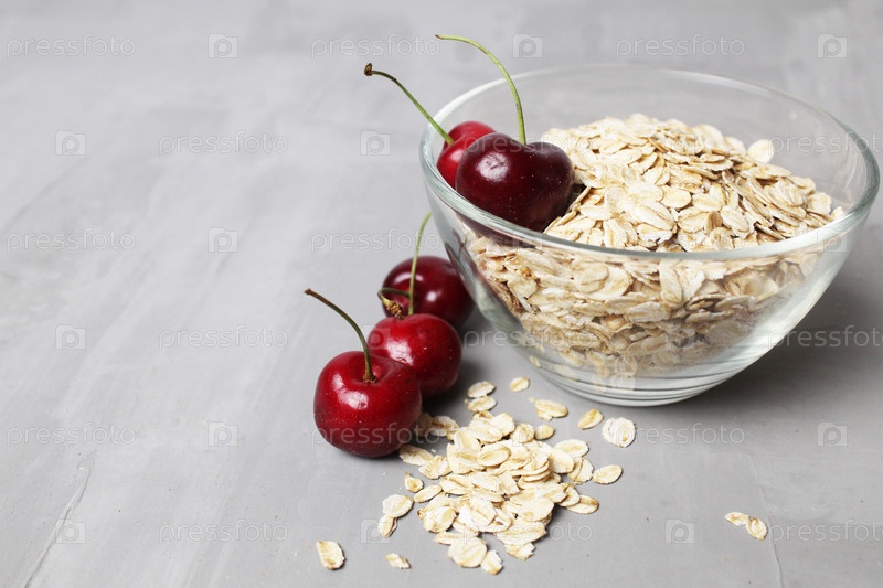 Овсяная каша овсяная каша в стеклянной миске с вишневыми ягодами на сером фоне с пространством для текста и кописпейса. здоровое диетическое питание
