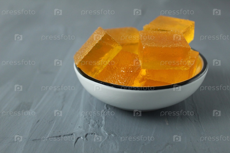 Оранжевый апельсиновый мармелад в миске на сером фоне со смесью для текста. полезный десерт на агаре. Апельсиновые кубики, кусочки мармелада