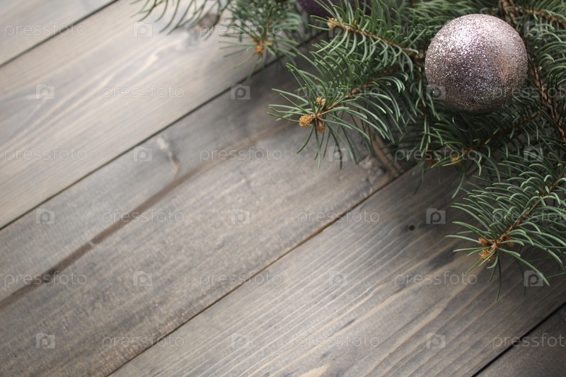 Фонд ветки рождественской елки с праздничными шарами фиолетового серебряного цвета на фоне черного дерева со пространством для текста copyspace