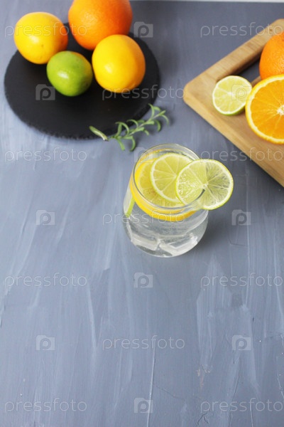 Натюрморт: цитрусовый лимонад из лимонов, апельсина, лайма в стакане с фруктами на подносе на сером фоне с местом для текста. Здоровые напитки. Летние напитки