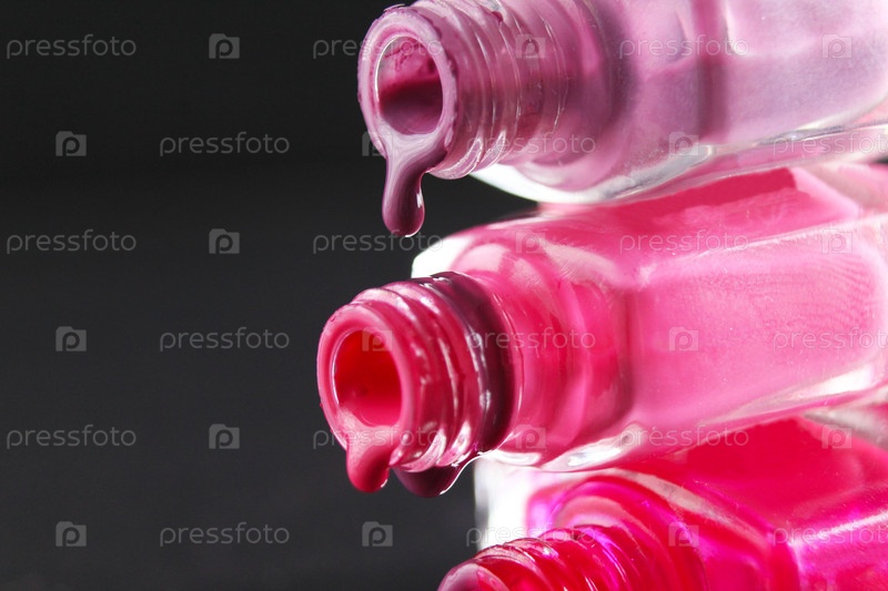Капли рыжего бородатого розового лака для ногтей текут из бутылки бутылки на черном темном фоне с копирайтом