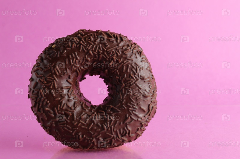 Шоколадный берлинский пончик на розовом фоне с местом для текста, национальное блюдо десерт завтрак copyspace
