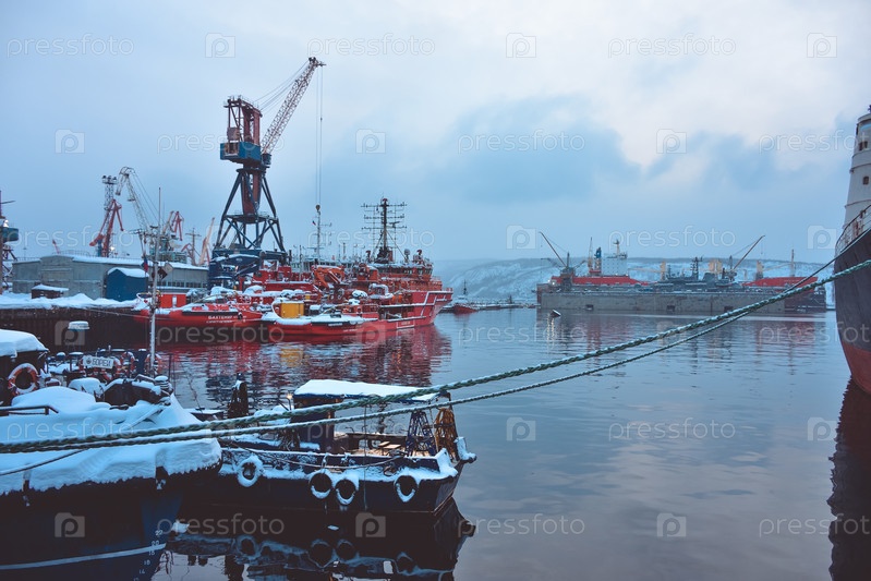 Мурманск, Россия - 7 марта 2021 года: корабли в доках зимой