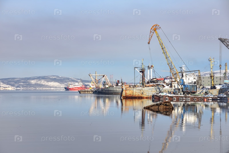 Мурманск, Россия - 7 марта 2021 года: корабли в доках зимой