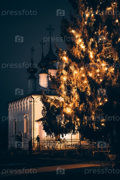 Суздаль / Россия - 07 марта 2020 г.: Церковь Входа Господня в Иерусалим, Рождественская елка на фоне церкви