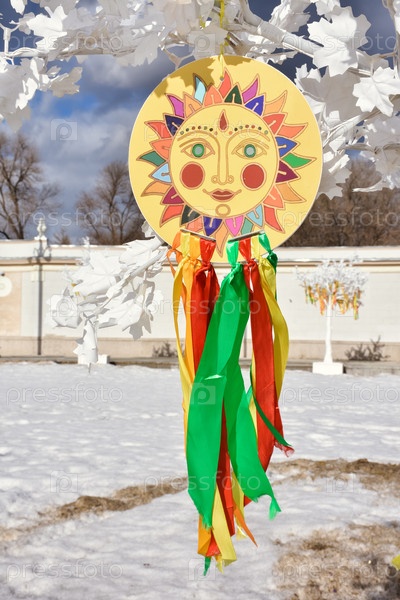 Эмблема солнца с разноцветными лентами на ветвях, изображение солнца