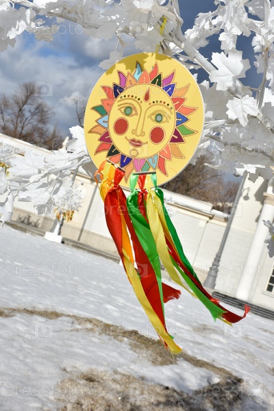 Эмблема солнца с разноцветными лентами на ветвях, изображение солнца