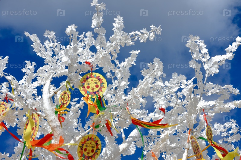 эмблема солнца с красочными лентами на ветвях белого дерева