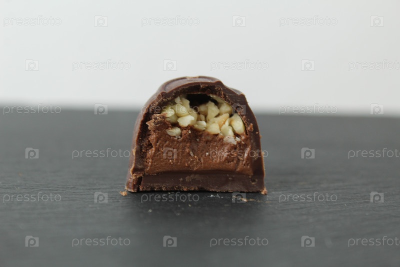 Разрез шоколадного ящика конфет, набитых шоколадной пралинкой и измельченными арахисами крупным планом на сером фоне с пространством для текста copyspace. Шоколадный день Сладкие домашние десерты