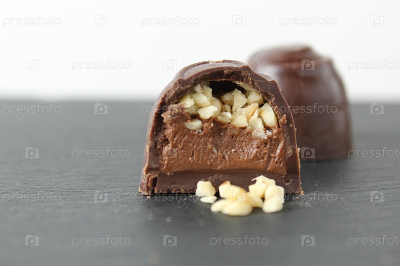 ШОКОЛАДНАЯ КОНФЕТКА С ШОКОЛАДНОЙ НАЧИНКОЙ ПРАЛИНЕ ГАНАШ И ДРОБЛЕННЫМ АРАХИСОМ НА СЕРОМ ЧЕРНОМ ФОНЕ. День шоколадных сладостей без диет