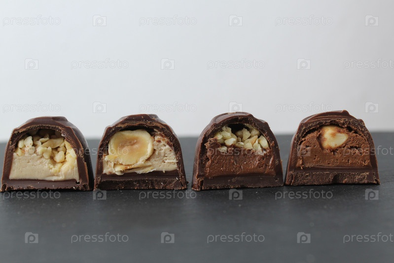 Шоколадные конфетки corus в разделе с начинкой из белого шоколада со сливочным маслом, арахисом, пралинком, ганча на сером фоне с пространством для текста и копирайта. суточные шоколадные сладости без диеты