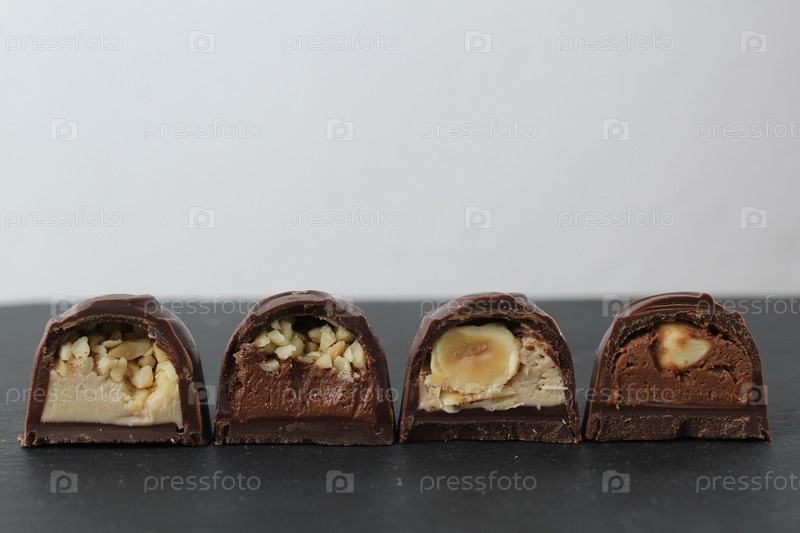 Шоколадные конфетки corus в разделе с начинкой из белого шоколада со сливочным маслом, арахисом, пралинком, ганча на сером фоне с пространством для текста и копирайта. суточные шоколадные сладости без диеты