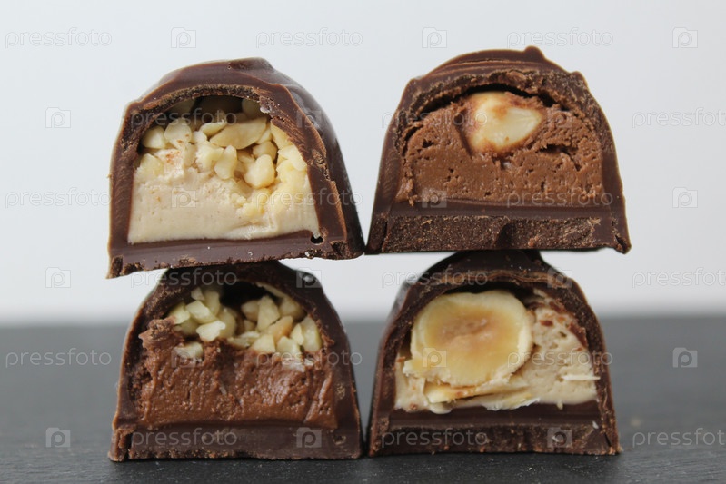 Четыре шоколада в матовых орехах цельный дробленый арахис фундук темный светлый шоколад крем пралине крупным планом лежат друг на друге