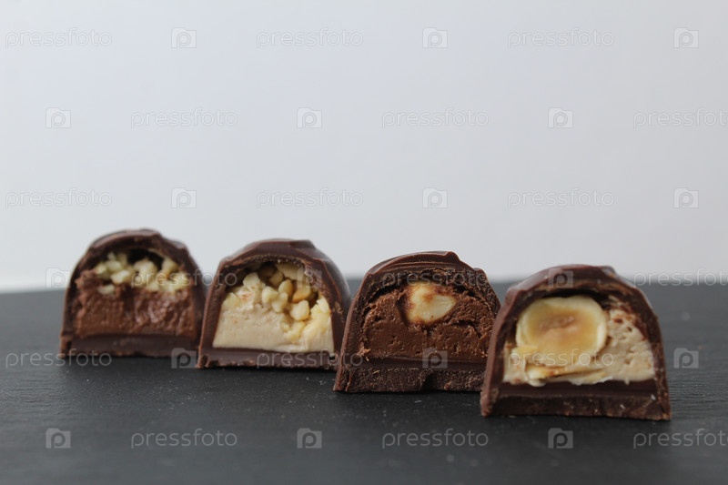 Четыре шоколадных конфетки с фундуком, арахисовой пралинкой, шоколадом крупным планом на сером фоне с местом для текста copyspace