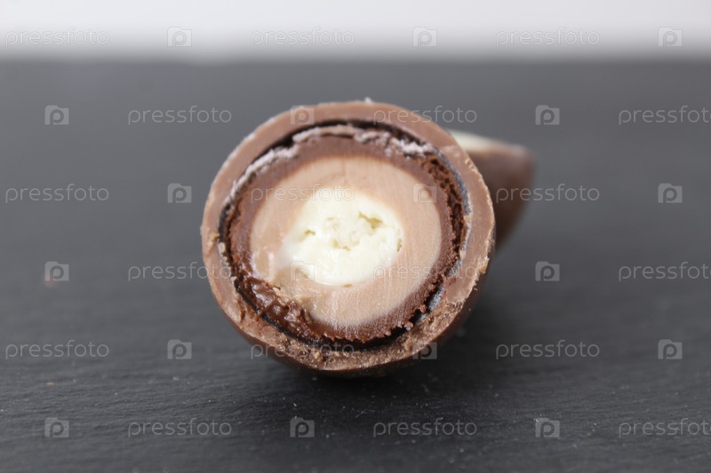 Шоколадная круглая конфетная сфера со слоями белого и темного шоколада в разрезе. День шоколада, шопоголизм. Десерт. сладости сладкая жизнь