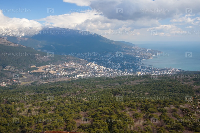 Живописный вид на город Ялту и Черное море с горы Ай Петри в Крыму весной