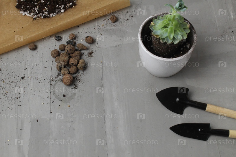 Пересадка растений в домашних условиях. растения в горшке горшок горшок госпиталь песок земля камни на сером фоне с пространством для текста copyspace. благоустройство квартиры дома