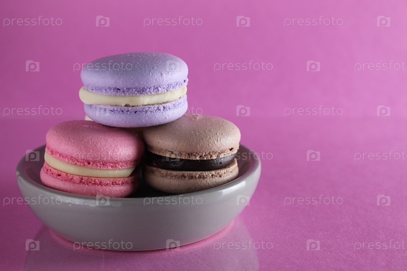Три разноцветных миндальных печенья на серой тарелке стоят на розовом фоне с местом для текста и копирайта