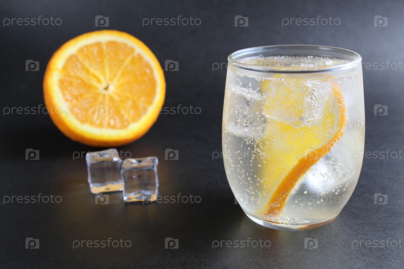 Лимонад с апельсином и льдом в стакане на черном фоне рядом лежит лед и апельсин. Летний напиток на черном фоне