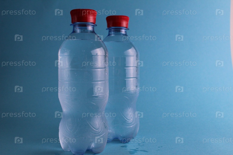 Питьевая минеральная вода в пластиковых бутылках на синем фоне с местом для текста и копирайтом. чистая вода. Холодные безалкогольные напитки. Освежающий