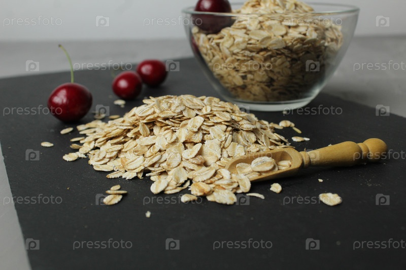 Овсянка на черном подносе и чашка стеклянной миски рядом с ягодами вишни. Ролик пищевой автрак. Домашняя кухня