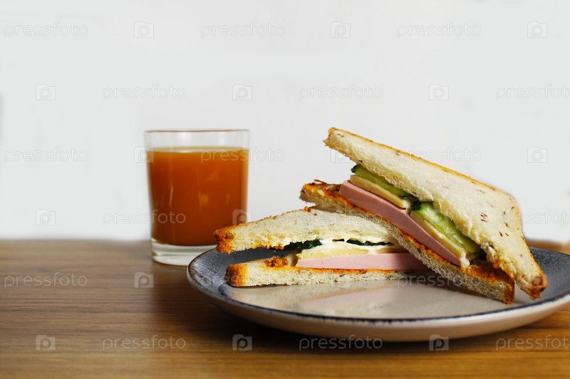 Завтрак, обед, закуска, сэндвич, сэндвич с колбасой, ветчиной, сыром, огурцом, зеленью лежит на тарелке рядом со стаканом апельсинового персикового сока. Европейский завтрак