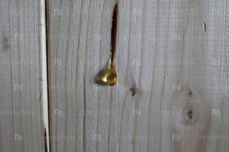 Капля смолы капает по сосновой доске. качество свежих дощатых строительных материалов