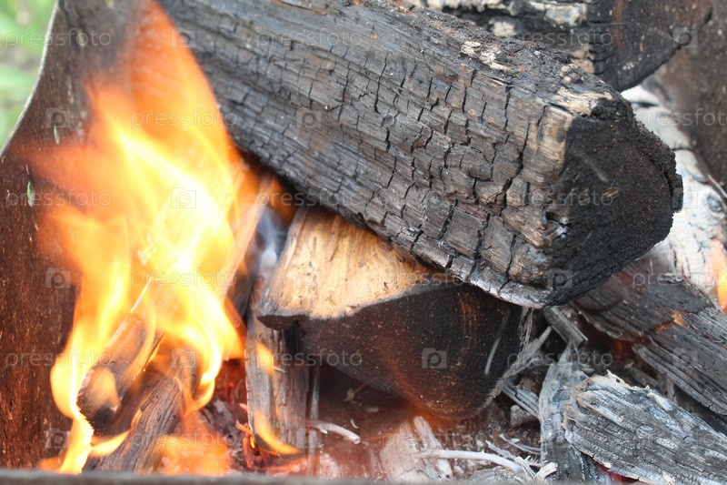 Костер с дымом крупным планом в темноте на черном фоне. Сжигание дров, дров
