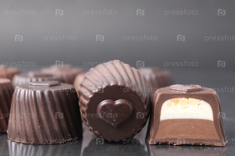 Шоколадный футляр конфеты в разделе с начинкой шоколадно-ванильный мусс ганаш с арахисовым орехом на черном фоне с пространством для текста. Сладости