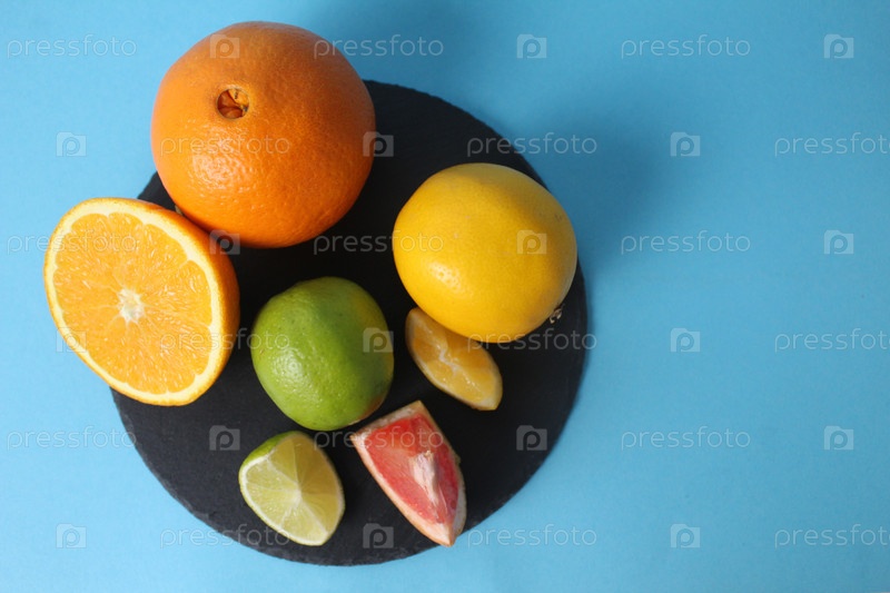 Цитрусовые, апельсины, лимоны, грейпфруты, лаймы лежат на черной подносе на синем фоне с местом для текста и инвентаря