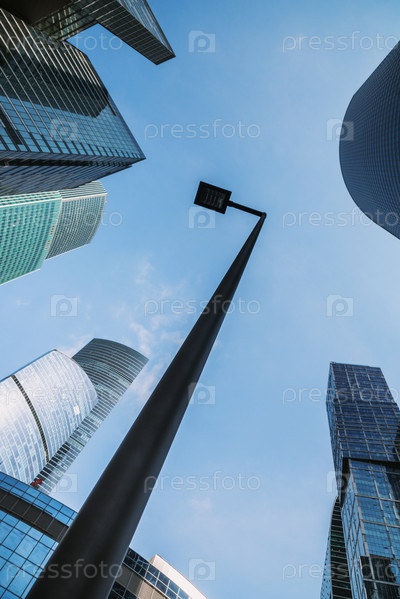 Небоскребы в деловом районе Москва-Сити. Вид на башни снизу вверх. Москва. Россия