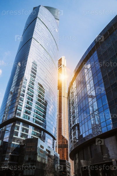 Небоскребы в деловом районе Москва-Сити. Вид снизу вверх на башни на фоне голубого неба. Москва. Россия