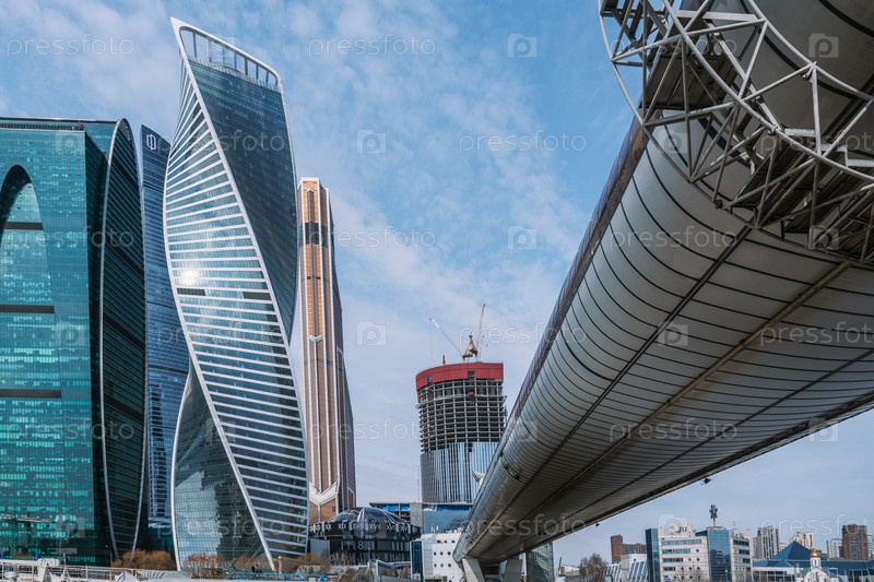 Пешеходный мост Багратион на Москве-реке с небоскребами Москва-Сити на заднем плане в Москве. Россия