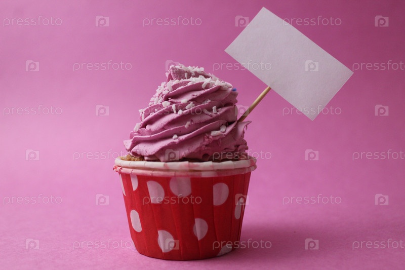 Кексовый торт с розовым кремовым топом на розовом фоне с местом для текстового макета. Сладкий, калории, сахар, праздник, день рождения, приветствие. фуксия сиреневая