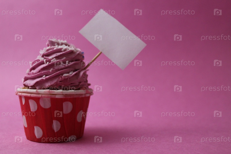 Кексовый торт с розовым кремовым топом на розовом фоне с местом для текстового макета. Сладкий, калории, сахар, праздник, день рождения, приветствие. фуксия сиреневая