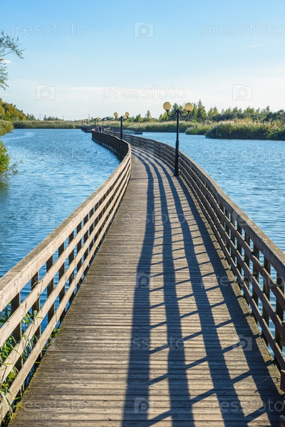 Длинная деревянная набережная вдоль побережья Балтийского моря. Янтарный. Калининградская область. Россия
