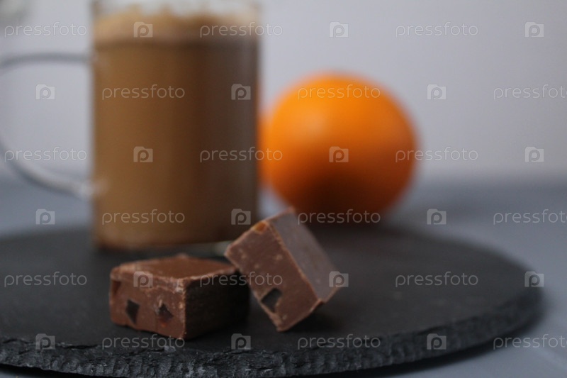 Шоколадные конфеты с кусочками кофе и апельсина на сером подносе с кофе и апельсином на заднем плане. Конфеты ручной работы. Десерт и кофе