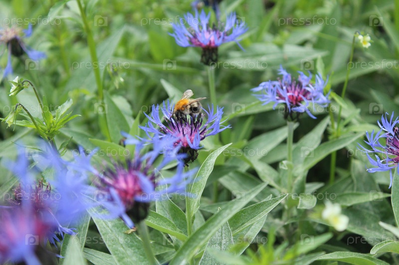 Цветы василька в траве. цветение лекарственной равы. Синий дикий цветок