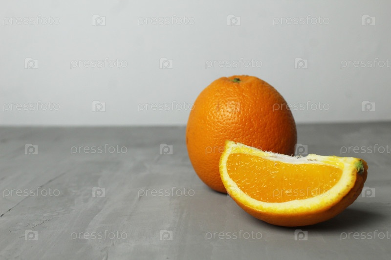 Оранжевый фрукт оранжевый на сером фоне с местом для текста сезонные фрукты витамина с. Выборочный фокус