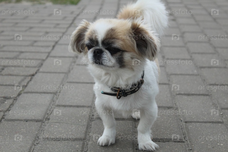 Маленькая собачка тибетского спаниеля в городских условиях на тротуарной плитке. Мелкие племенные собаки. Домашние питомцы