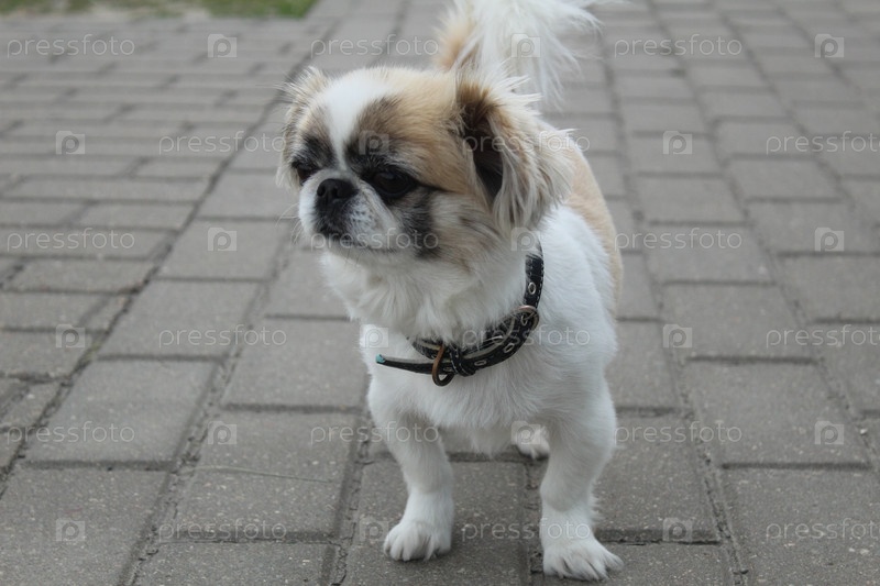 Маленькая собачка тибетского спаниеля в городских условиях на тротуарной плитке. Мелкие племенные собаки. Домашние питомцы