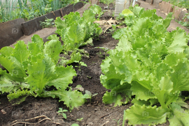 Выращивание зеленого салата. зеленый салат растет на грядке в земле. Витамины летом полезные диетические продукты