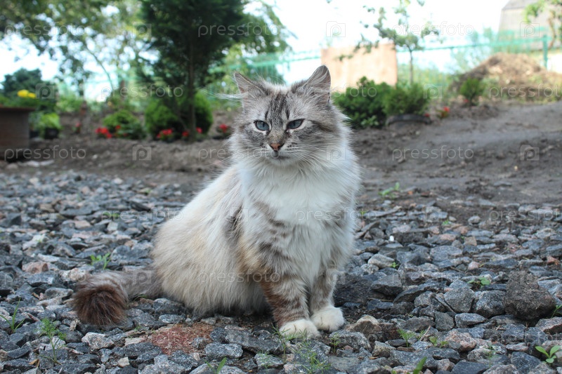 Серая белокурая кошка сидит на камнях с голубыми глазами, сидящими на камнях. Городские животные. Содержание животных дома