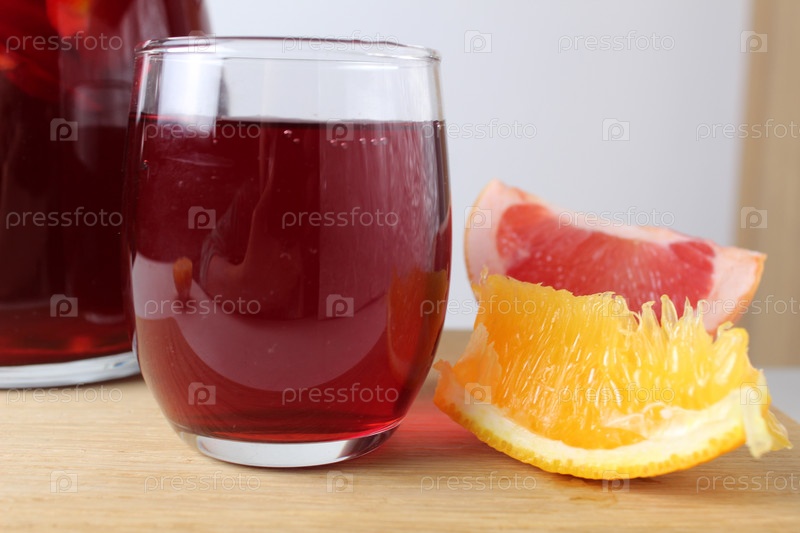 Красный напиток сок виноградный красное вино в стакане сангрии в стакане рядом лежат фрукты апельсины грейпфрут крупным планом. напитки для зимних холодов. Согревающие напитки атмосфера праздника